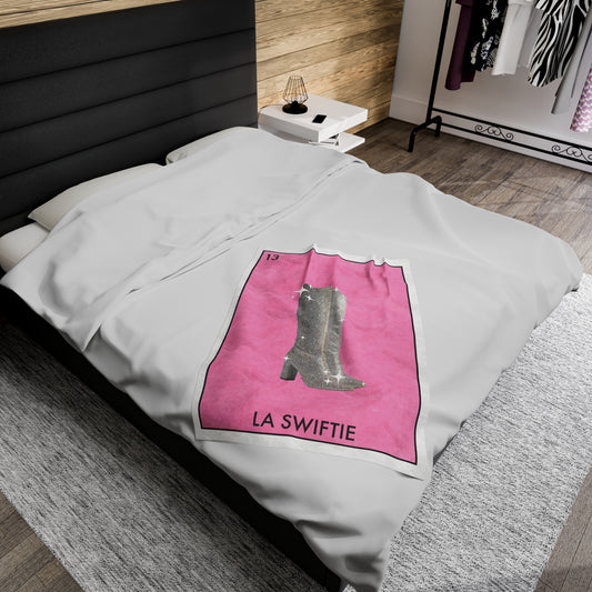 La SWIFTIE Loteria, Pink Plush Velveteen BLANKET | Glitter Silver Boots | 30x40", 50x60" and 60x80"