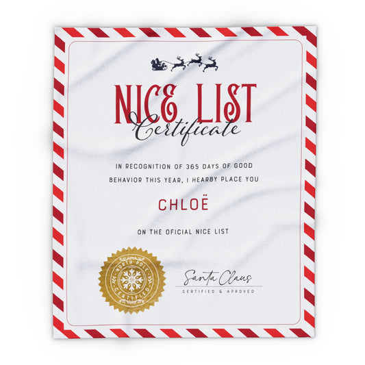 NICE LIST Announcement Personalized Fleece BLANKET | Custom Name Certificate | Candy Cane Frame, Gold Santa Seal | 30x40", 50x60" and 60x80"