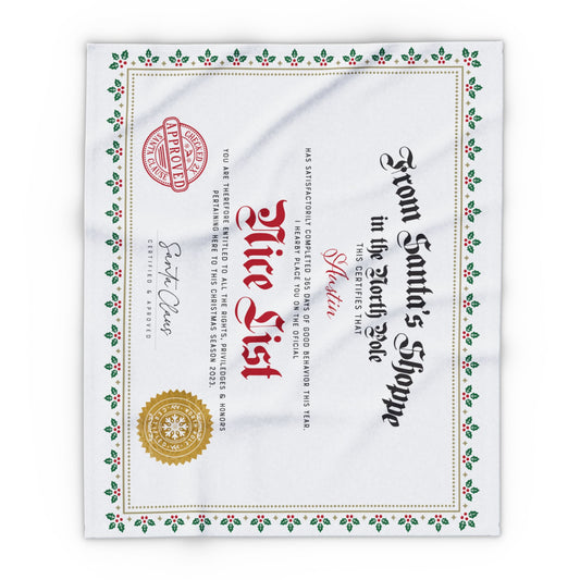 Personalized Fleece BLANKET | Custom Name NICE LIST Certificate Greenery Frame Diploma with Gold santa Seal | 30x40", 50x60" and 60x80"