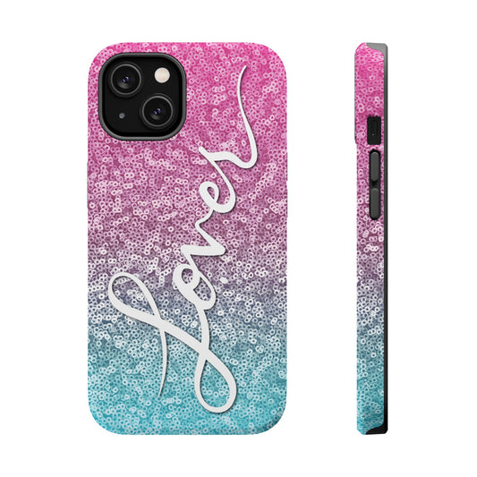 MagSafe Tough Cases | LOVER Pink Blue SEQUIN Glitter | iPhone 15, 14, 13 | Perfect Unique Valentine's Day Gift for Wife, Girlfriend