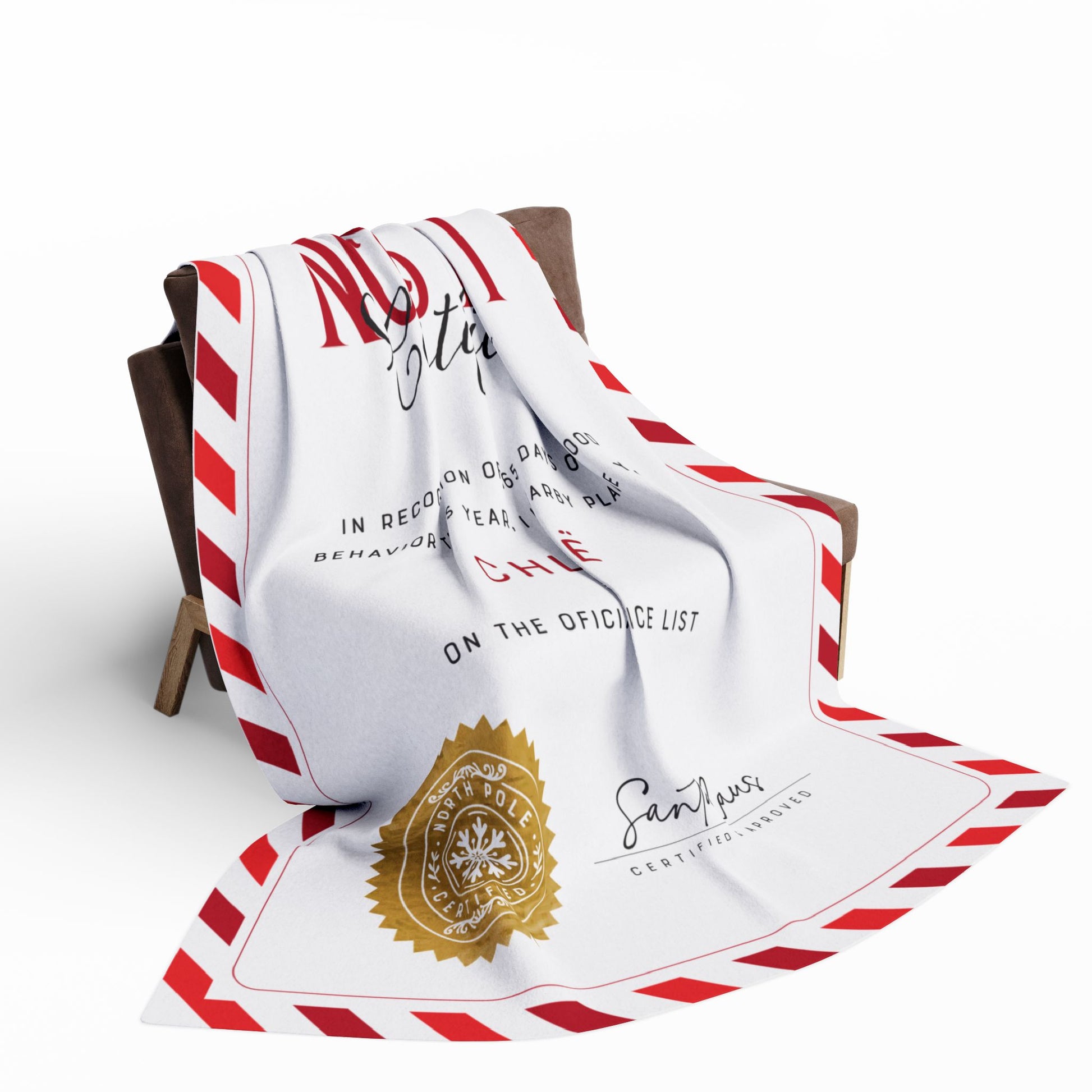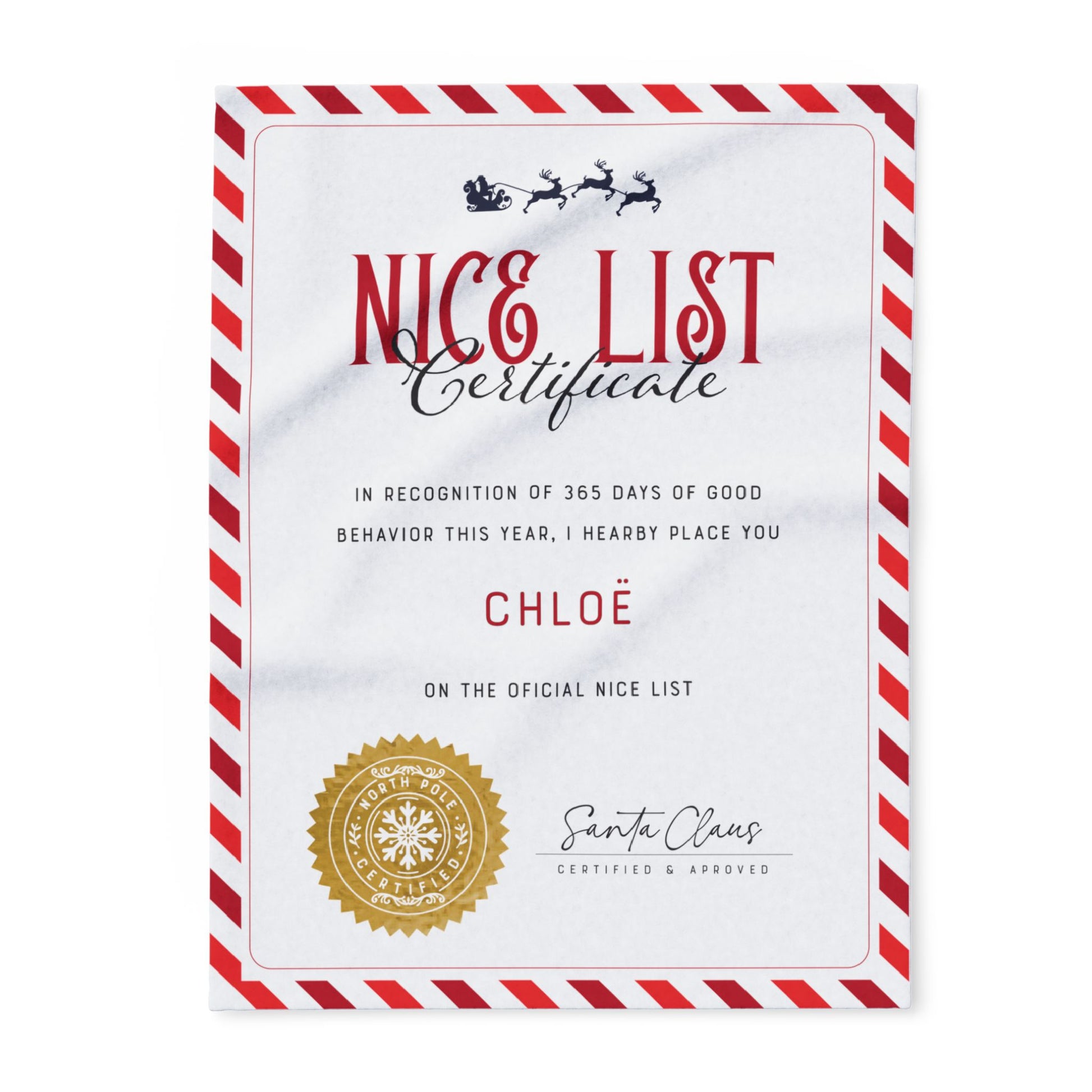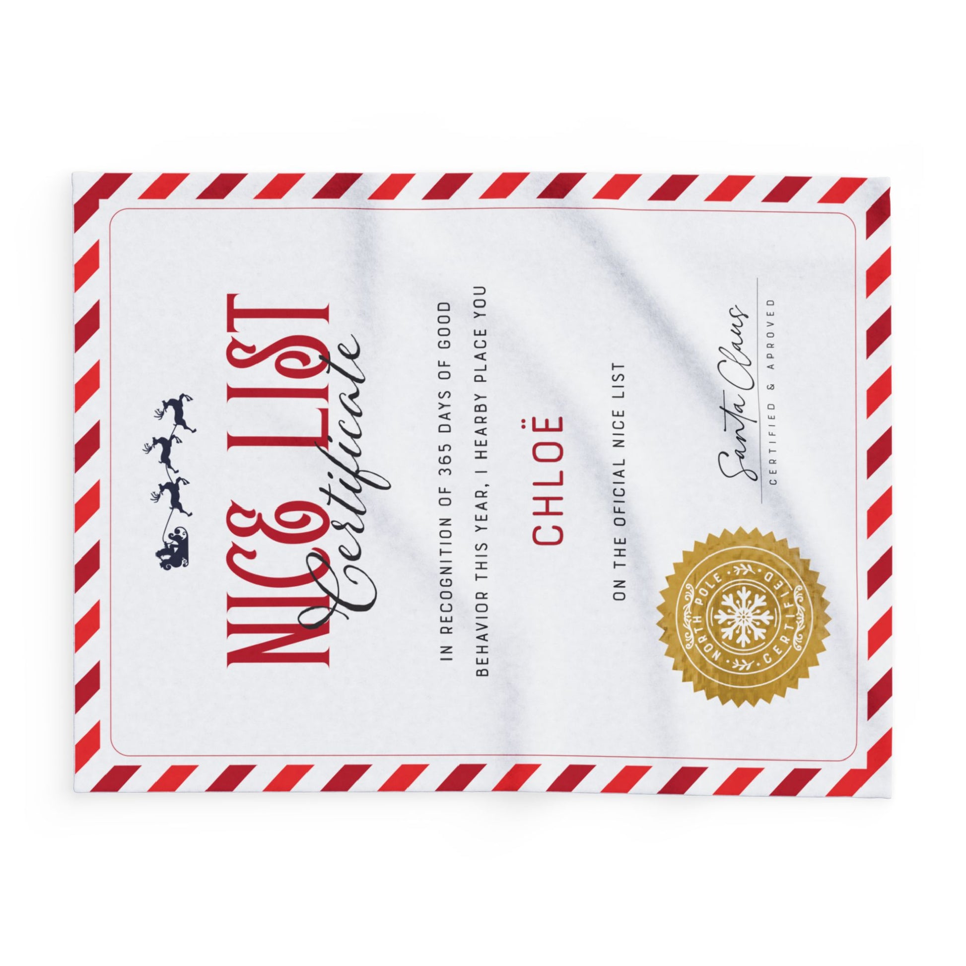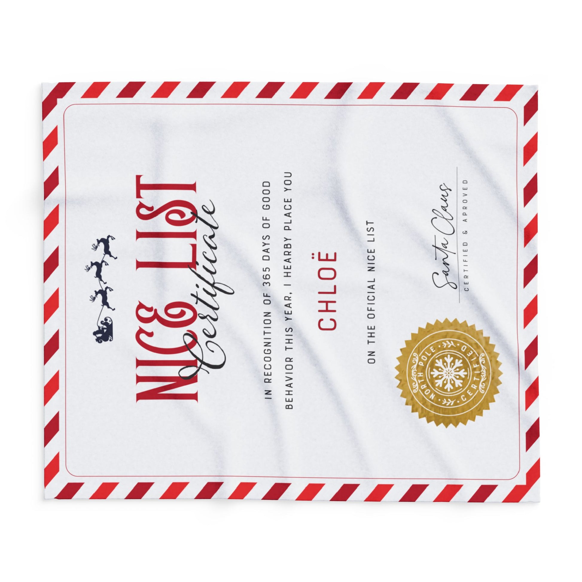 NICE LIST Announcement Personalized Fleece BLANKET | Custom Name Certificate | Candy Cane Frame, Gold Santa Seal | 30x40", 50x60" and 60x80"